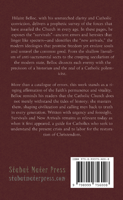 More than a catalogue of errors, this work stands as a ringing affirmation of the Faith's permanence and vitality. Belloc reminds his readers that the Catholic Church does not merely withstand the tides of history; she masters them, shaping civilization and calling men back to truth in every generation. Written with urgency and foresight, Survivals and New Arrivals remains as relevant today as when it first appeared, a guide for Catholics who seek to understand the present crisis and to labor for the restoration of Christendom.